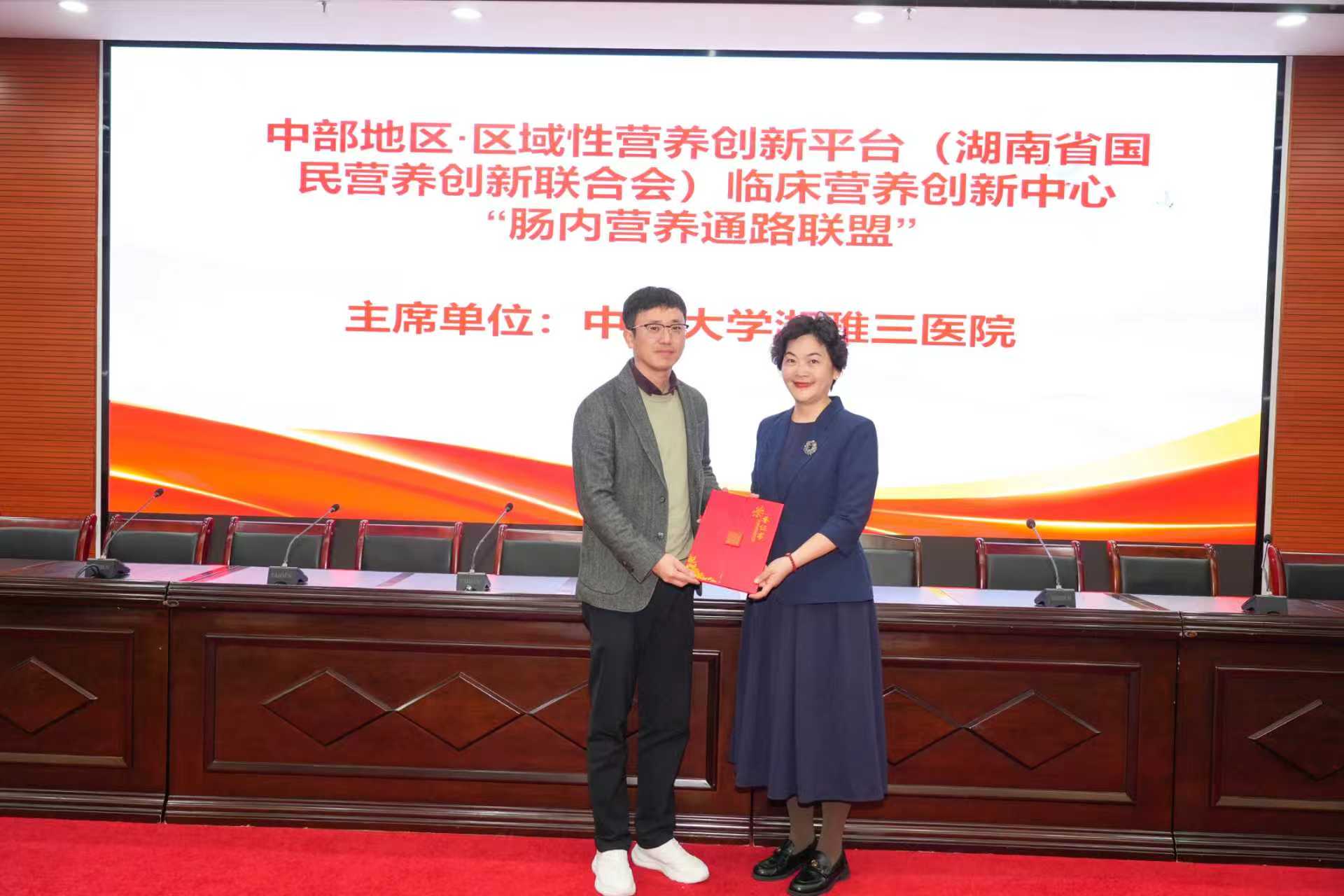 曾朝喜教授宣读了《关于成立中部地区·区域性营养创新平台(湖南省国民营养创新联合会)临床营养创新中心肠内营养通路联盟的批复》:中南大学湘雅三医院为联盟主席单位,湘雅医院、湘雅二医院、湖南省肿瘤医院为副主席单位,其他15家地州市医院为联盟单位。