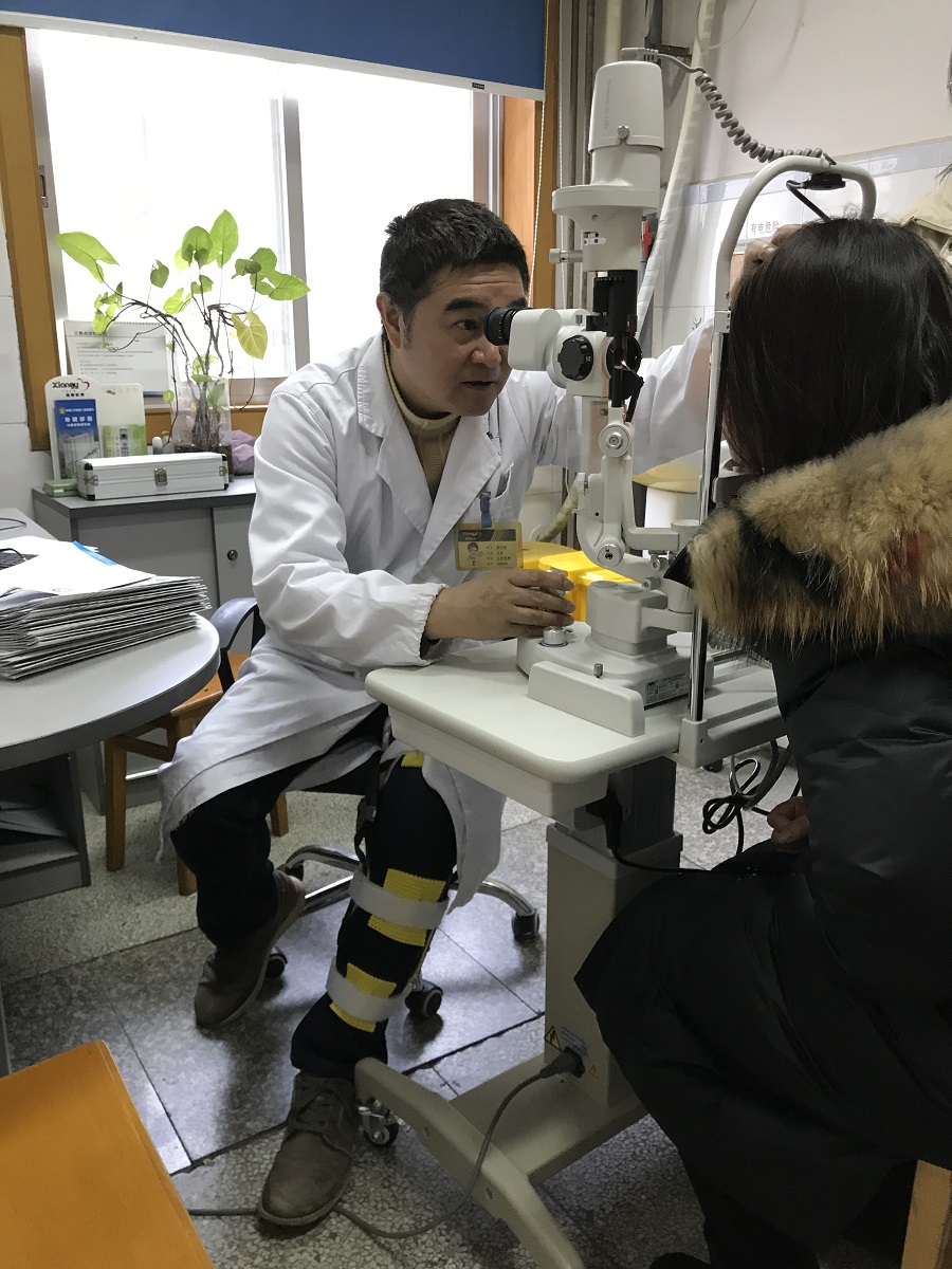 春节过后的门诊迎来了一波高峰,一大早门诊大厅已人山人海。眼科门诊的候诊区也早已坐满等候就诊的患者。差不多快到叫号时间,一诊室的门却还一直紧闭着,有的患者开始焦急起来,正当此时,一诊室的唐仁泓教授拖着打着支架的腿从门口走进来,及时赶到。