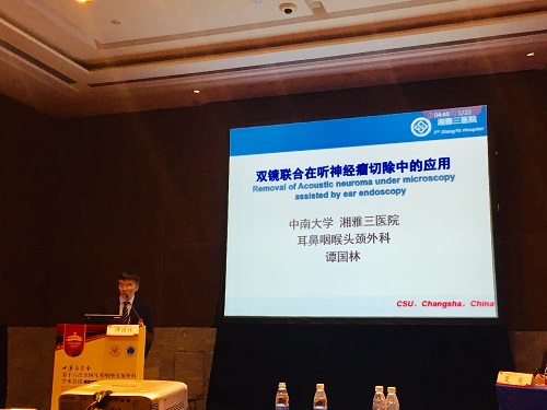 湘雅三医院谭国林教授受邀作关于“双镜联合经迷路后进路的听神经瘤切除”及“翼管神经切断对合并哮喘的变应性鼻炎的疗效”专题报告,宋业勋主治医师作关于“Identification of six genes and biological characteristics of head and neck squamous cell carcinoma by integrated bioinformatics analysis”的国际论坛及中青年英文专场的大会发言,引起了现场专家的关注以及在场同仁的热烈交流讨论。