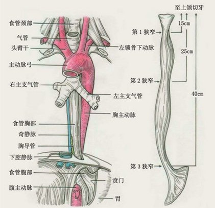 据心胸外科介绍,在人体器官中食管有三个狭窄弯曲:第一个狭窄位于食道的起端,即咽与食道的交接处;第二个狭窄在食道入口以下7cm处,该部位是食道内异物易存留处也是最危险的地方,因为主动脉弓从其左侧穿过和左支气管从食道前方越过,一旦异物刺破食道壁,伤及主动脉弓就可能造成致命性的大出血;第三个狭窄是食道通过膈肌的裂孔处。