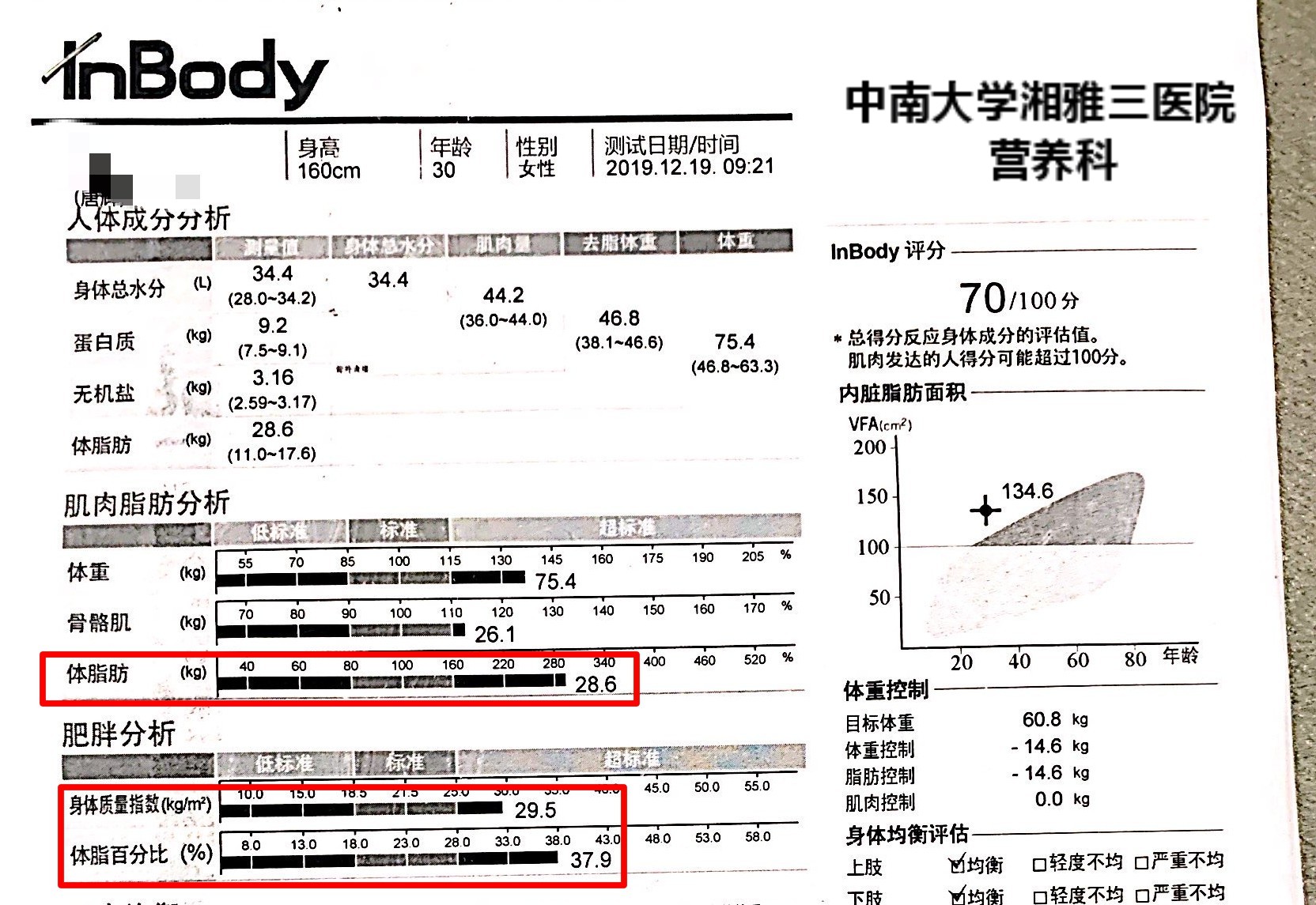 刘敏第一次接待这位准妈妈时,她身高160cm,体重75.4kg,BM I 29.45kg/m2,跟丈夫从2014年开始备孕,一直未受孕,后赴多家医院检查,均未查出有何明显异常。2015年开始准备尝试试管婴儿,但是因为肥胖,无法进行。她尝试过很多种减肥方法,减肥成功后又反弹,这让她懊恼不已,听说湘雅三医院营养科可以科学减肥,就抱着试一试的心态来了。营养科为她完善了相关检查,排除了内分泌性继发性肥胖,发现肝肾功能等结果都很好,但是餐后2小时血糖7.86mmol/L,属于糖尿病前期,且有明显的胰岛素抵抗;人体成分分析显示体脂肪量有28.6kg,体脂百分比有37.9%,而女性正常的体脂百分比应为20%~25%;膳食结果分析发现,她每天摄入的热量超标,蛋白质不足。