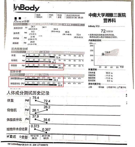 在减脂半个月以后进行了复查,发现她的体重下降了6斤,且全都是脂肪,这个结果让她信心大增,于是更加努力地坚持减脂行动。截至目前,在科学减脂的指导下成功减掉了14斤,餐后血糖已经正常了,胰岛素抵抗明显好转,并且迎来自然受孕的好消息!