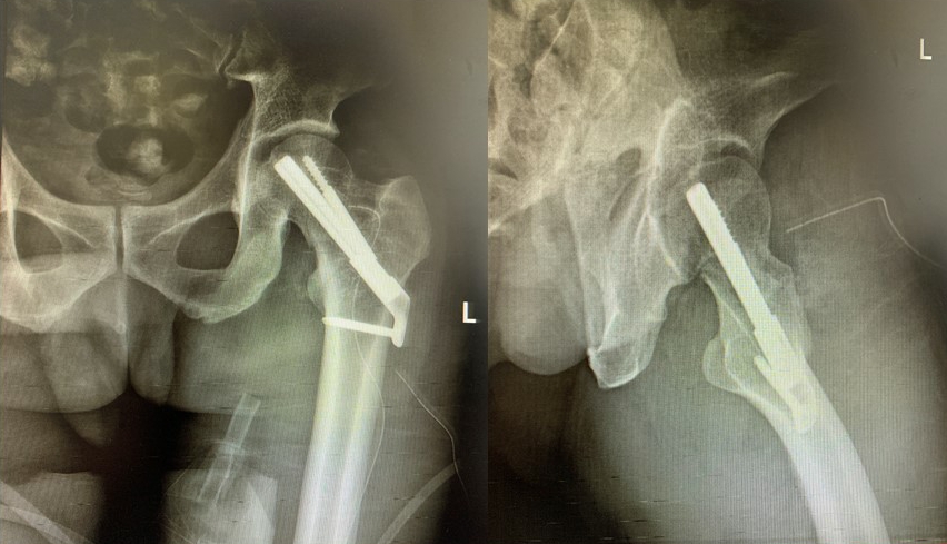 创伤骨科主任罗令带领郭强博士、李骁宁博士等创伤骨科团队成员立即开展讨论,制定了详细周密的手术计划,根据骨折类型及本人意愿,最终决定采用一种新型内固定系统——股骨颈动力交叉钉系统(FNS),力争以最小的创伤获得最坚强的固定效果和最好的预后。整个手术过程顺利,骨折闭合复位和置钉位置均十分理想,术后复查固定效果满意,患者恢复良好。