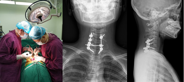 脊柱外科主任邓幼文教授和神经外科主任王知非教授联袂主刀,历时6小时成功将这枚颈部“炸弹”成功拆除,颈部神经毫发无伤。术后一周,患者肌力感觉基本恢复正常,已下地行走。