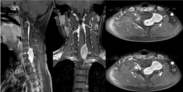 患者所患肿瘤位于C5-T1平⾯椎管内,椎管80%空间已被肿瘤侵占,颈段脊髓受压非常严重。如肿瘤继续生长或者轻微外伤,患者就会完全性截瘫,犹如颈部被安放了一颗炸弹,一旦引爆,后果不堪设想。