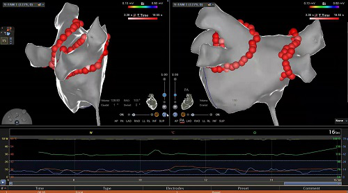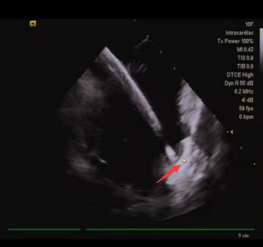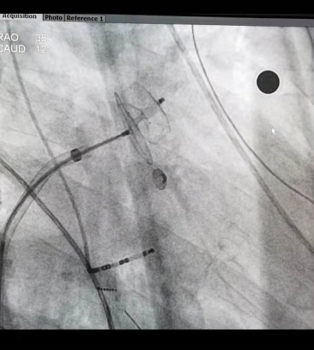 术中,张志辉教授带领罗文治主治医师及邓煦主治医师,首先对病人进行房颤的环肺静脉电隔离及左心房基质改良,随后应用心腔内超声,对患者的左心耳形态及直径大小进行了精确测量,结合X线下造影的影像,使用了ACP20mm的左心耳封堵器对患者左心耳进行封堵,封堵器到位顺利,一次性展开成形,再次应用腔内超声对展开后的封堵器进行测量,封堵器完美封堵左心耳开口,且对左心耳附近的结构没有影响,遂释放封堵器。整个手术过程患者均在清醒状态下,术中患者各项生命体征平稳。