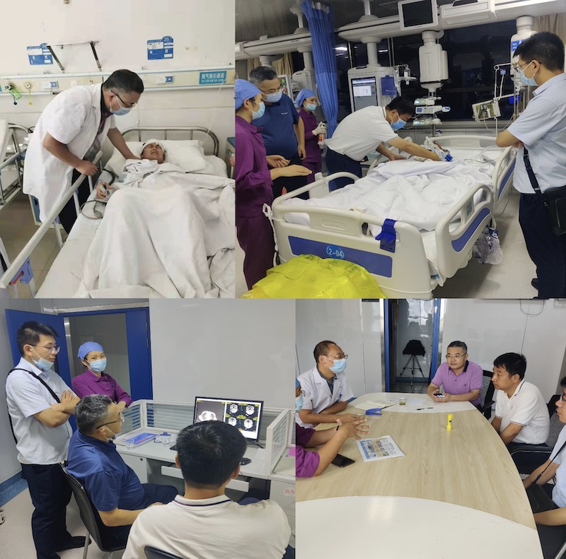 伤情就是命令,时间就是生命!邓幼文教授迅速协调好科室工作,指派脊柱外科中坚力量臧晓方教授、谭伟主治医师火速驰援湘西。晚间 7点30分,由脊柱外科主任医师臧晓方、 主治医师谭伟以及 重症医学科副主任医师杨兵厂组成的专家团队连夜赶赴湘西,一路上通过电话远程指导救治。凌晨1点,专家团队顺利抵达湘西州人民医院,争分夺秒赶往 ICU 查看病人,仔细查体、阅片、分析病情,并提出诊疗意见。其中一例重症病人当时情况危急,血压进行性下降。在新湘雅专家团队的精心指导和当地医院的紧密配合治疗下,患者血压逐步恢复正常,病情趋于稳定。