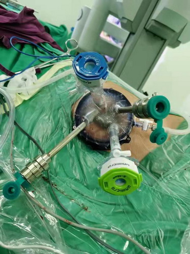 目前,国内外医院普遍采用的常规机器人辅助手术,需要在腹部或者腰部打4-6个孔,给予医生较大的操作空间。而单孔机器人手术操作将原本相隔8cm且需要多个操作孔的“空间优势”减少到仅仅一个孔,减轻了机体创伤,加快了术后康复。操作空间显著减少,手术难度明显提升。但为了尽可能减少患者的创伤和疼痛,在微创外科理念的指导下,汪金荣副教授团队通过调整并改良机器人镜头和操作臂的位置关系,连续成功实施了省内首例单孔机器人辅助巨大肾上腺肿瘤切除、膀胱全切和肾输尿管全长切除术。