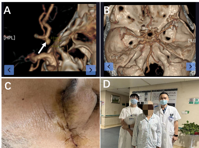 A.术前CTA显示前交通动脉瘤(白色箭头显示动脉瘤)B.术后CTA显示动脉瘤完全夹闭 C.手术切口 D.术后4天患者下床活动,与医生合影。