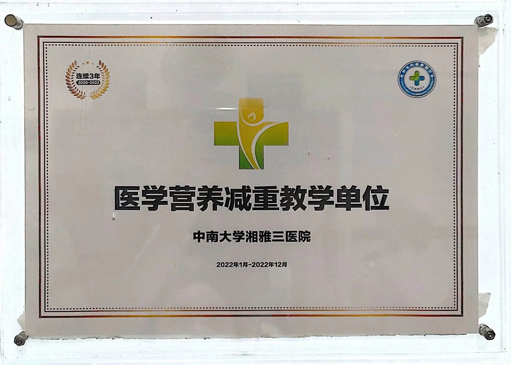 中南大学湘雅三医院营养科以“以人为本,宣传普及营养知识,倡导科学合理的饮食观念,提倡绿色健康的生活方式”为宗旨,把传统观念中的“以膳食为重点”的营养科转变为“临床、科研和教学并重的临床营养学科”,在国内营养科领域有较高的医疗、教学和学术声誉,是湖南省域最强的营养科医疗服务和技术中心之一。2022年,营养科再次获得中国健康促进会“医学营养减重教学单位”,这也是临床营养科连续三年荣获该荣誉。未来,营养科将继续以人民健康为中心,助力健康中国战略的实施。