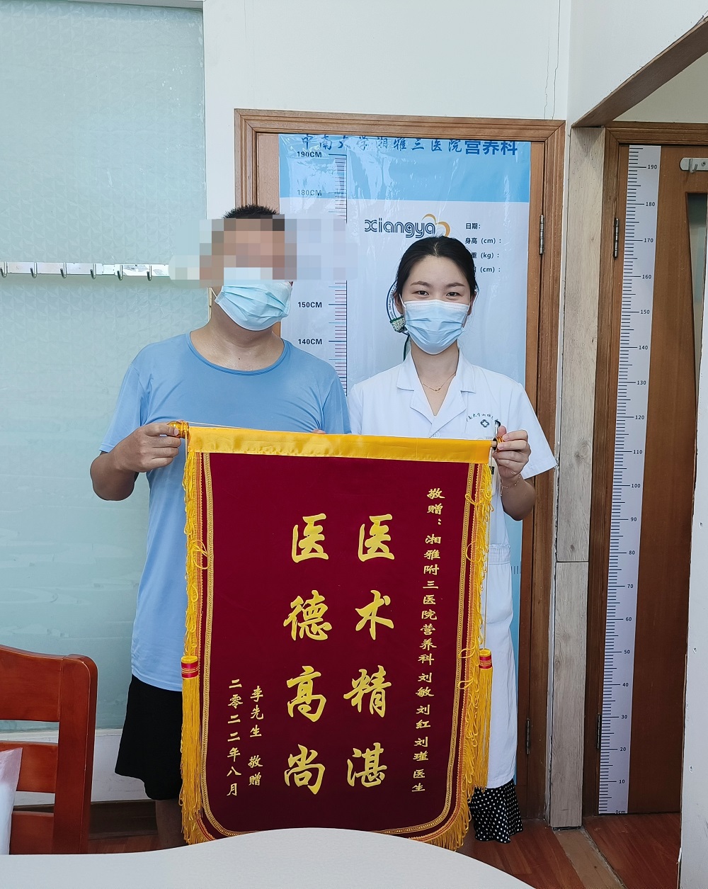 8月10日,患者李先生为中南大学湘雅三医院营养科全体医师送上了“医术精湛 医德高尚”锦旗,感谢医院营养科通过科学规范化的饮食及运动方案帮助其成功减脂。