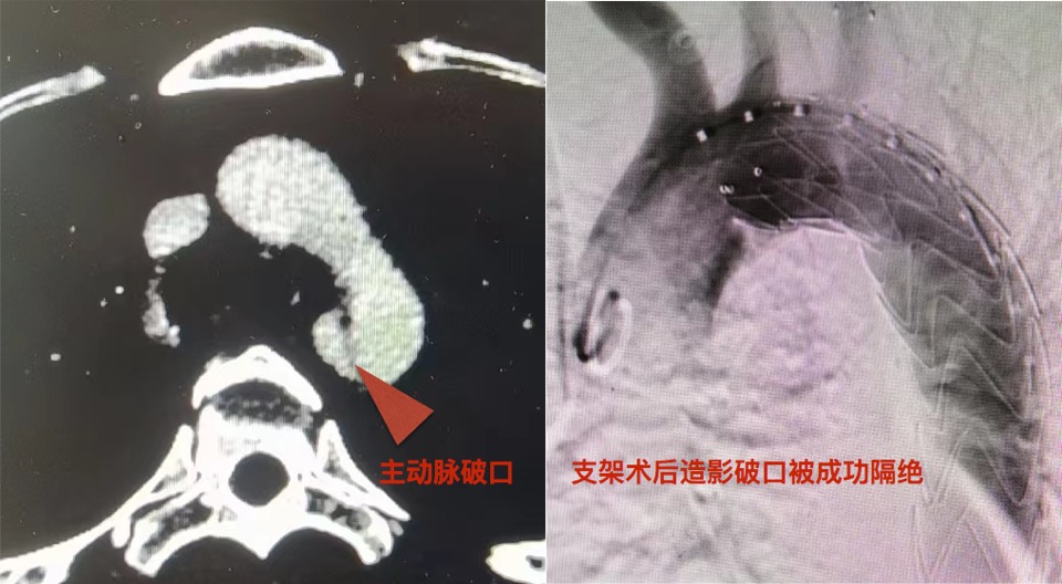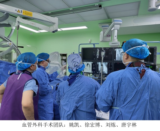 肝胆胰I外科冯超、黄为团队与血管外科姚凯、徐宏博团队联合会诊后,决定为龚先生先行DSA下腔内修复主动脉夹层,而后立即行开腹肝脏修补手术。术前准备迅速有序进行,麻醉科、复合手术室接到急诊手术通知后迅速配备麻醉医师、手术护士及相关器械设备。在各科室大力协助下,血管外科团队为龚先生急诊施行胸主动脉左锁骨下动脉一体化覆膜支架置入术,进行主动脉破口隔绝,随即肝胆胰I外科团队行肝脏修补手术,手术顺利。目前龚先生正在30病区肝胆胰I外科术后护理。