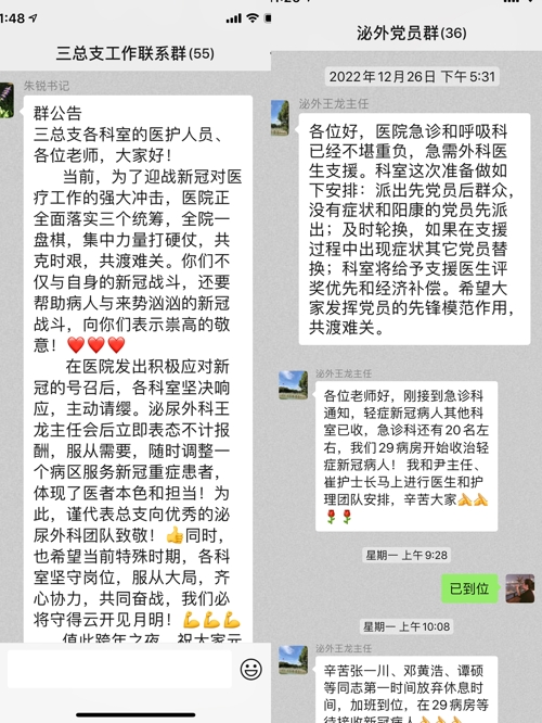 泌尿外科将两个病区第一时间进行合并,抽调大量人力支援发热门诊、急诊、重症监护、胸外病区、全科病房等。1月2号正值元旦,泌尿外科党支部书记、主任王龙在接到通知后即刻组织科室人员返岗,不到48小时,泌尿外科二十九病区重启收治38名新冠老年患者,即使是在深夜,科室10余名医护人员依旧坚守在工作岗位,为新入患者全面做好入院处置。