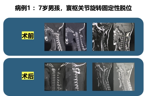 第一位位患儿张某,7岁,湖南湘潭人,2个月前因在家中翻跟斗时不甚扭伤脖子,导致颈部畸形伴活动受限,当时未予重视。2个月过去了,患儿斜颈愈发加重,家长担心影响孩子发育,遂到当地医院就诊,当地医师接诊后考虑诊断为“寰枢关节脱位”,并告知患者家长此类难度大、风险高,建议到中南大学湘雅三医院就诊。患儿家长慕名找到脊柱外科颅椎学组李劲松组长。经过仔细的病史询问、查体及完善影像学资料后,诊断为“寰枢关节旋转固定性脱位”。