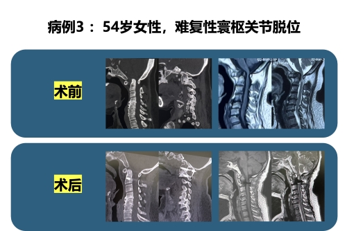 第三位患者张女士,54岁,贵州省三穗县人。张女士务农为生,4个月前无明显诱因出现颈部胀痛伴四肢麻木,当地医院行保守治疗无效,症状极速加重,很快不能拿筷子吃饭,走路形同醉酒步态,经过当地医院医师推荐,患者连夜从三穗县赶到求诊。颅椎组李劲松接诊后,诊断为“寰枢关节脱位,高位颈脊髓病”。由于患者神经症状非常重,必须尽快手术治疗。