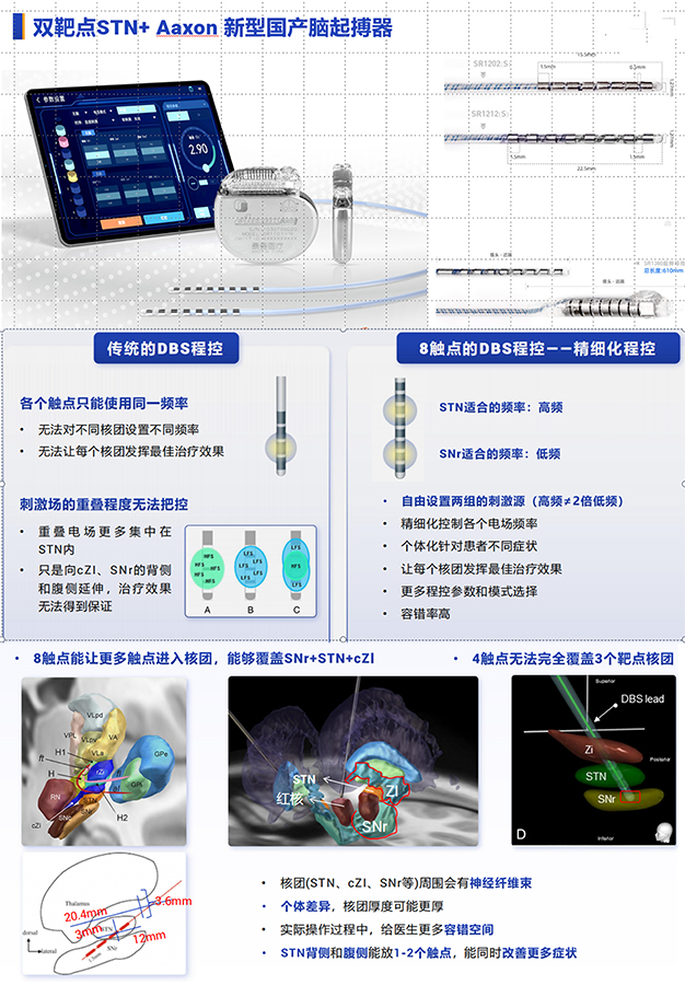 据团队成员介绍,患者为77岁的女性,患帕金森病5年,肢体抖动逐渐加重,服用药物已无法控制,严重影响正常生活,处于帕金森病中晚期,有明确手术指征。考虑到患者病程长,症状较重,常规靶点疗效有限,目前国内外已有双靶点联合治疗的先例,疗效更好,之前受限于电极触点个数和治疗参数,无法很好的将两个靶点的疗效发挥出来,此次8触点脑起搏器一上市,神经外科团队立刻想到了为有多个靶点联合治疗需求的患者应用。