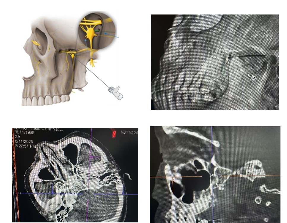 8月中旬,两位患者前后来到中南大学湘雅三医院疼痛科就诊后,经完善相关检查及疾病特征分析,两位患者均被确诊为“丛集性神经痛”。该病发作时痛苦剧烈,且传统治疗方法效果有限,给患者造成极大的身心负担。经科室讨论,胡蓉教授团队决定为两位患者施行神经调控治疗——在Dyna-CT引导下进行蝶腭神经脉冲射频手术。该技术通过解剖定位及影像导航将细针精准穿刺至翼腭窝,诱发出与术前一致疼痛后,通过脉冲射频调控神经功能从而达到止痛目的。手术过程在半小时内完成,无切口、并发症少、安全性高,患者术后第二天即可出院。