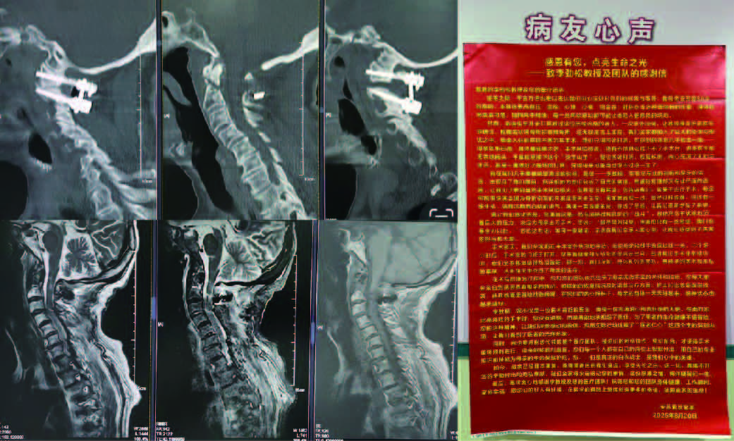 8月14日,手术如期开展。由李劲松副主任医师、彭毅主治医师组成的手术团队为安奶奶实施 “颅骨牵引下后路固定融合术”,创新性采用双皮质固定螺钉 + 横联板加固的方式,最大限度保障脊柱稳定性。整个手术过程平稳顺利,未进行输血,术后老人也无需转入重症监护室。此次手术不仅为安奶奶点燃了新生的希望,更刷新了科室上颈椎手术患者的最高龄纪录。8月22日,安奶奶康复出院,出院时已能行走活动自如,症状得到显著改善。