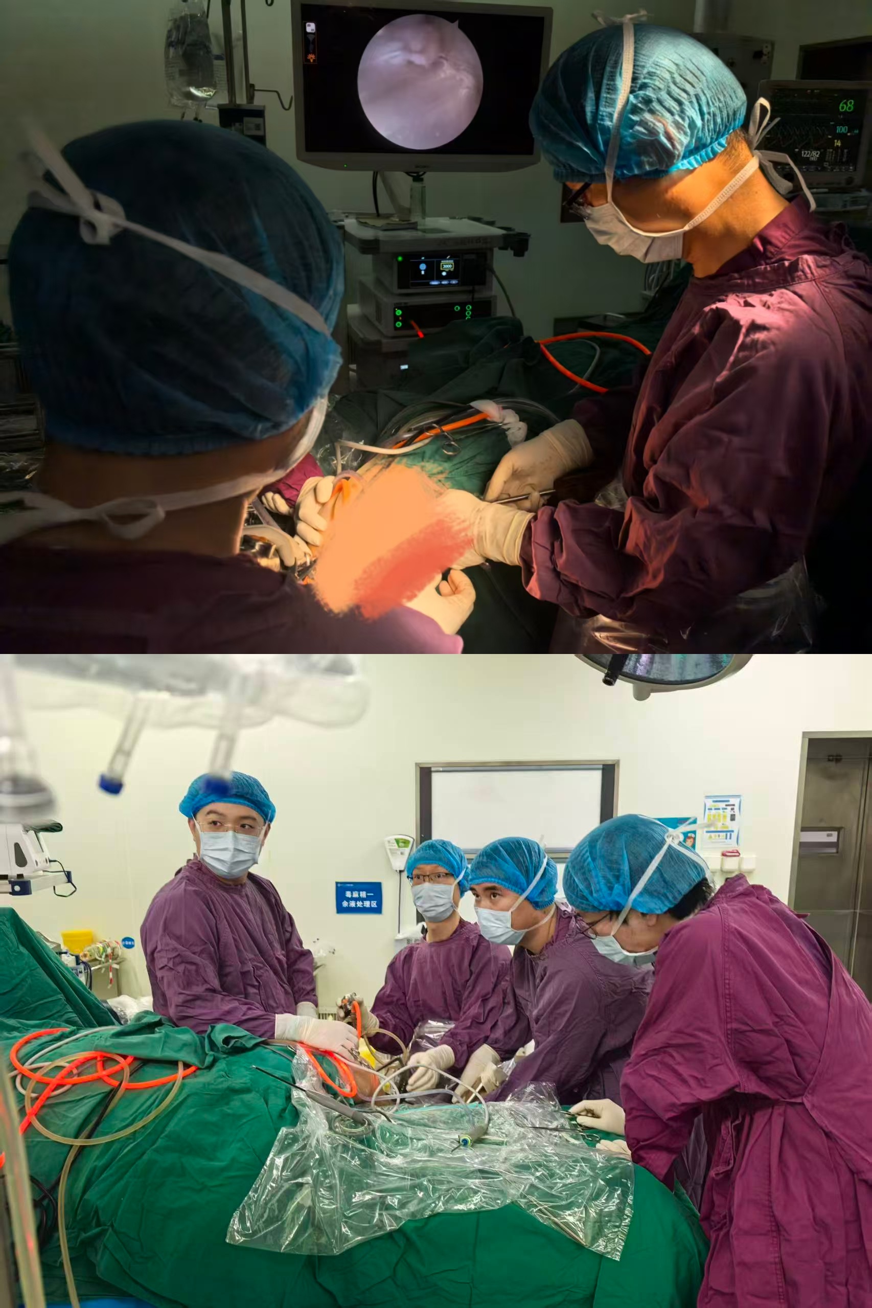 两位运动员均因长期高强度训练与对抗导致膝关节前交叉韧带断裂。与普通患者不同,他们提出了明确且急迫的诉求:必须尽可能缩短恢复周期,尽快回归高强度专项训练,以备战未来的重大赛事。面对这一挑战,由科室主任吴松教授统筹,运动医学带头人何金深副主任医师领衔,组建了包括骨科、麻醉科、手术中心、康复医学科在内的多学科协作小组,为两位运动员进行综合评估。最终,团队没有采用此前为“湘超”足球运动员普遍实施的自体韧带重建术,而是基于柔道项目的特殊性和运动员的康复时间要求,做出了一个关键决策:为两位运动员实施高精度的人工韧带等长重建术。相较于恢复周期较长的自体韧带重建,团队本次采用的人工韧带,不仅避免了在运动员身体其他部位取腱供区的二次损伤,其材料特性更允许术后早期进行更积极的康复。最关键的是,手术团队通过精确的解剖定位与隧道设计,力求实现韧带的“等长重建”,确保在柔道动作的极端角度以及与地面摩擦等因素下,新建韧带仍能保持最佳张力与稳定性,从而最大程度降低再损伤风险,保障运动寿命。