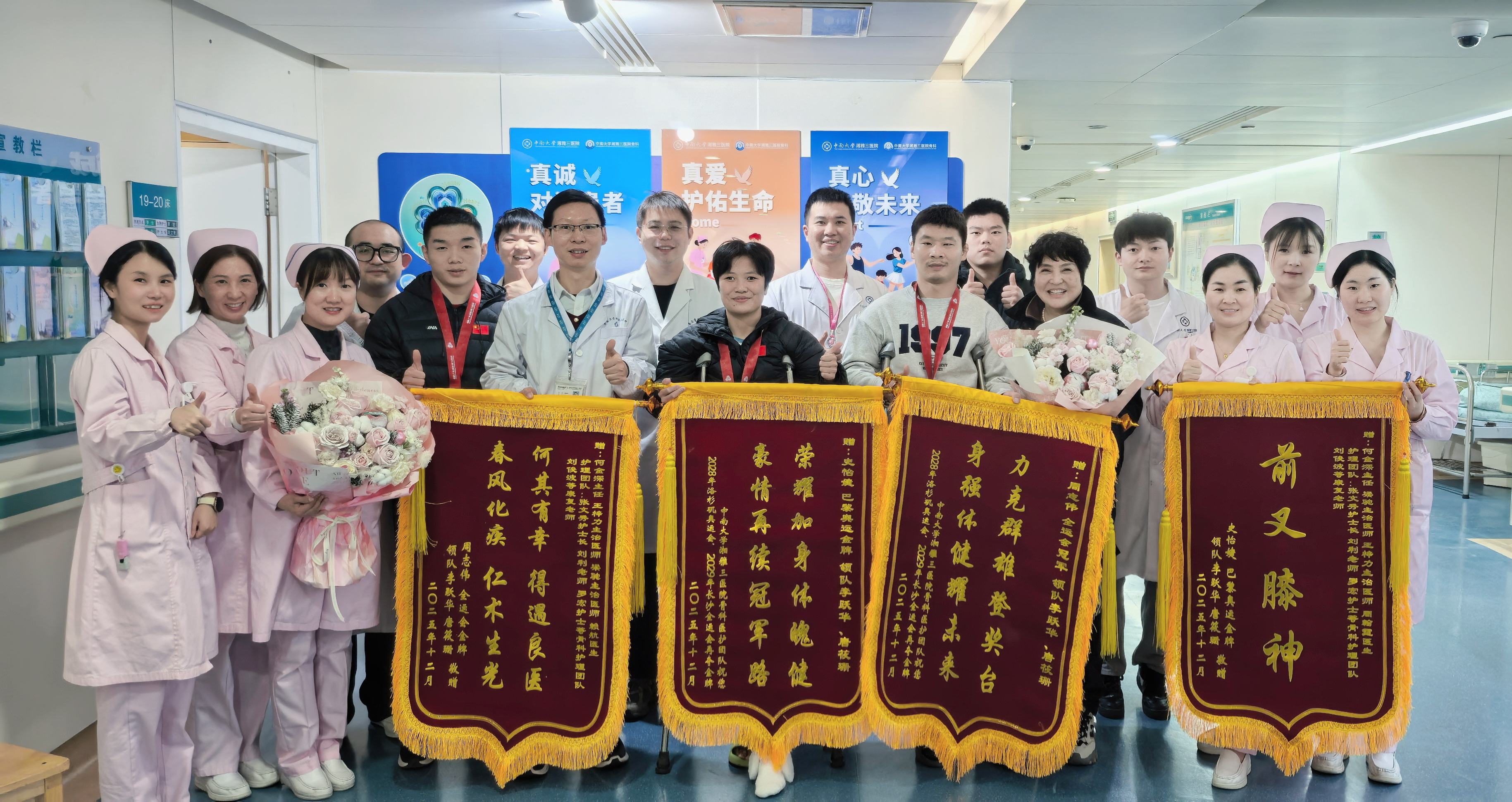 两位运动员的治疗过程,充分体现了医疗、保障与训练团队协同作战的全程管理模式。术前,骨科刘利老师全程协调,高效完成了从院前联络、入院办理到术前准备的各项安排,柔道队领队李跃华主教练、唐筱珊助理教练也全程参与沟通,共同确认手术方案与后续训练衔接需求。手术由何金深副主任医师带领梁驰主治医师、周翰霆住院医师、赖航住院医师共同完成,麻醉与手术中心护理团队全程护航。术后,病房护理团队在张文秀护士长的组织下,将专业照护与人文关怀融入恢复日常。此外,医疗团队迅速协同康复医学科及教练团队,围绕人工韧带特性与柔道专项需求,为史怡婕和周志伟“量体裁衣”,共同制定阶段性系统康复计划。该计划科学规划了从早期功能活动、中期肌力强化到后期专项爆发力与稳定性训练的完整路径,旨在支持两位运动员在安全的前提下,稳步、高效地重返巅峰竞技状态。