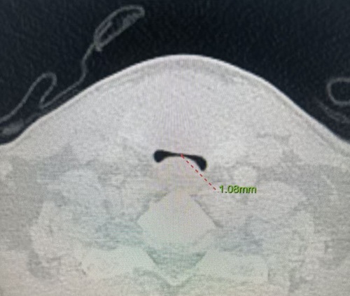 患者薛伯伯罹患甲状腺乳头状癌,肿瘤不仅侵犯被膜及周围结缔组织,更严重压迫气管,导致气管变形。CT提示气管受压显著,随时可能发生气管塌陷或术中大出血,引发窒息风险。此类病情常涉及气管切除重建、神经保护、术后气管插管及ICU监护等多重挑战。