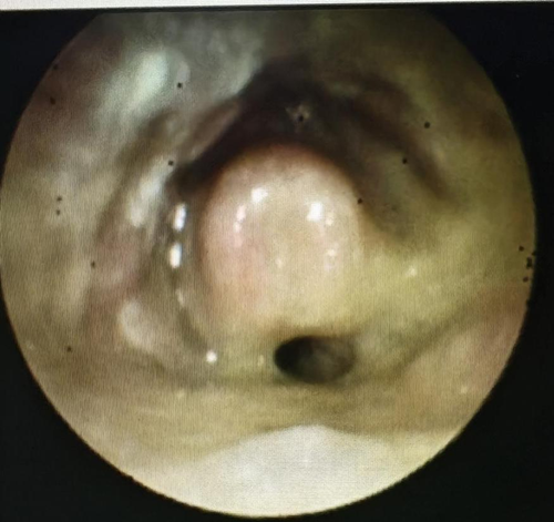 患者电子喉镜检查图(舌根、下咽、喉部大面积肿胀、溃疡合并脓性分泌物附着)