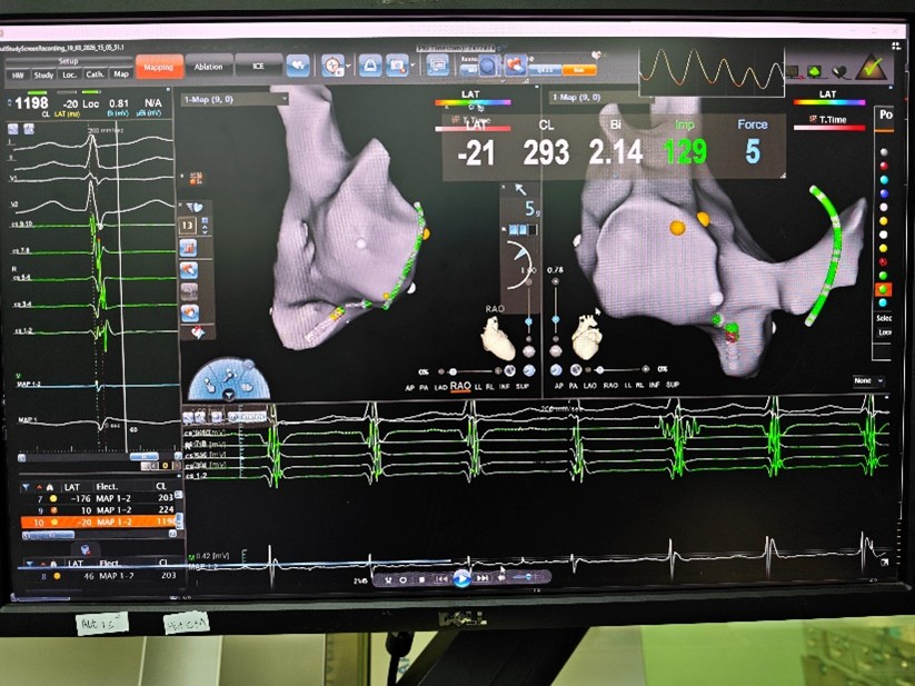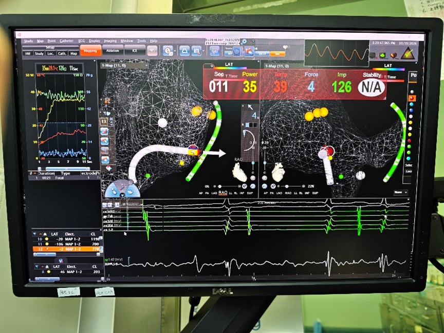 手术中,张志辉教授与罗文治主治医生凭借丰富的血管穿刺经验,精准建立手术路径。借助先进的三维电解剖标测平台,他们实时监测导管走形与头端压力,将导管顺利送入心腔。在心腔内,无需X射线辅助,团队迅速建立三维心腔模型,精准锁定并成功消融引发心动过速的异常病灶。整台手术历时不到一小时顺利收官,全程无放射线暴露,心律失常得以根治,胎儿安全也得到了最大程度的保障。