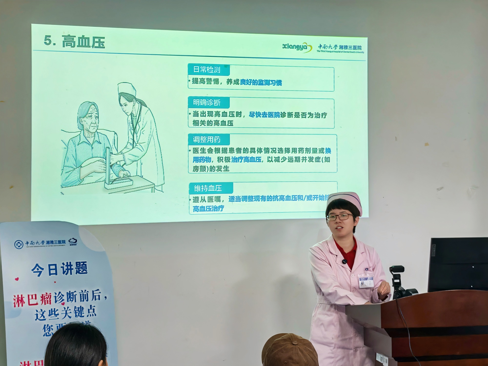 李成媛护士长聚焦《淋巴瘤靶向治疗常见不良反应及护理》,详细介绍了靶向治疗中可能出现的血液学异常、房颤、出血、感染、高血压、腹泻、皮疹等不良反应,并从饮食管理、卫生保洁、适度运动、心理疏导等方面给出科学应对建议,分享了居家护理的实用技巧。