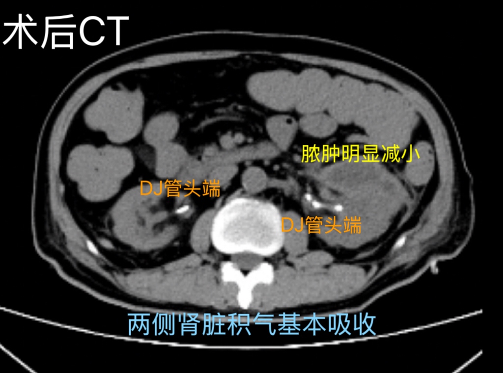 随后,团队顺利为患者实施双侧经皮肾镜手术+双侧输尿管DJ管置入术+左肾周脓肿引流术,术中彻底清除肾内大量脓苔以及结石,术后有效引流脓性尿液,全程操作精准高效。术后患者生命体征平稳,未出现感染性休克、出血等并发症,肾功能明显好转,肌酐从术前316mmol/L降至153mmol/L,救治效果显著。
