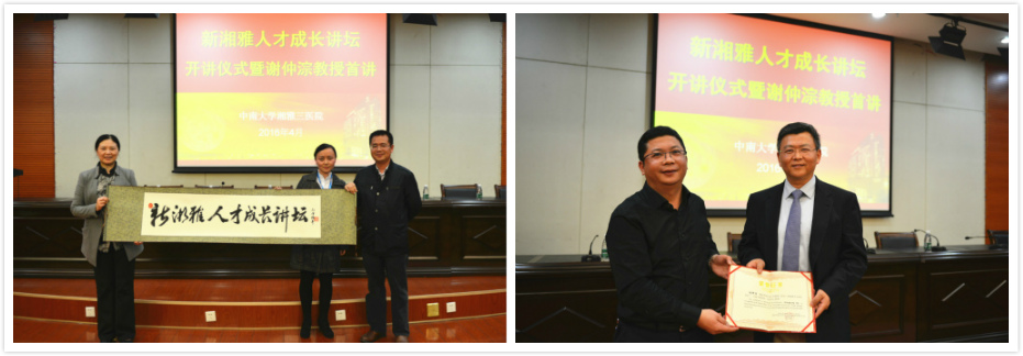 罗爱静书记为讲坛赠送“题字卷轴”,杨飞龙副院长为谢仲淙教授颁发主讲人证书
