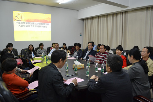 4 月25日,中南大学湘雅三医院分党校第5期入党积极分子培训班开班典礼在综合楼一会议室隆重举行。各党支部书记、党办、团委以及本期培训班22名学员参加了开班典礼。中南大学党校副处级调研员张国平,医院党委书记、分党校校长罗爱静,医院党委副书记兼纪委书记、分党校副校长吴希林,医院党委副书记兼工会主席邓云龙出席开班典礼。开班典礼由吴希林副书记主持。