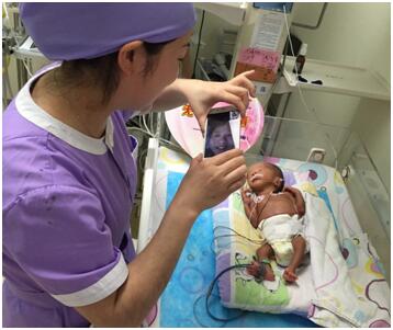 活动选取了母婴分离的三组NICU在院患儿家庭参与,分别是:母亲在产科而孩子在NICU住院的家庭组;参与家庭护理的家庭组;母亲产后已经回家而孩子仍需住院家庭组,在征求三组家庭同意后,医护人员通过手机无线网络视频连线患儿母亲,让母亲通过视频可以看到自己的宝宝,跟宝宝进行交流,向医生询问孩子的病情。最后送上小礼物——康乃馨、小礼包及育儿书籍,祝贺妈妈们“母亲节’快乐!