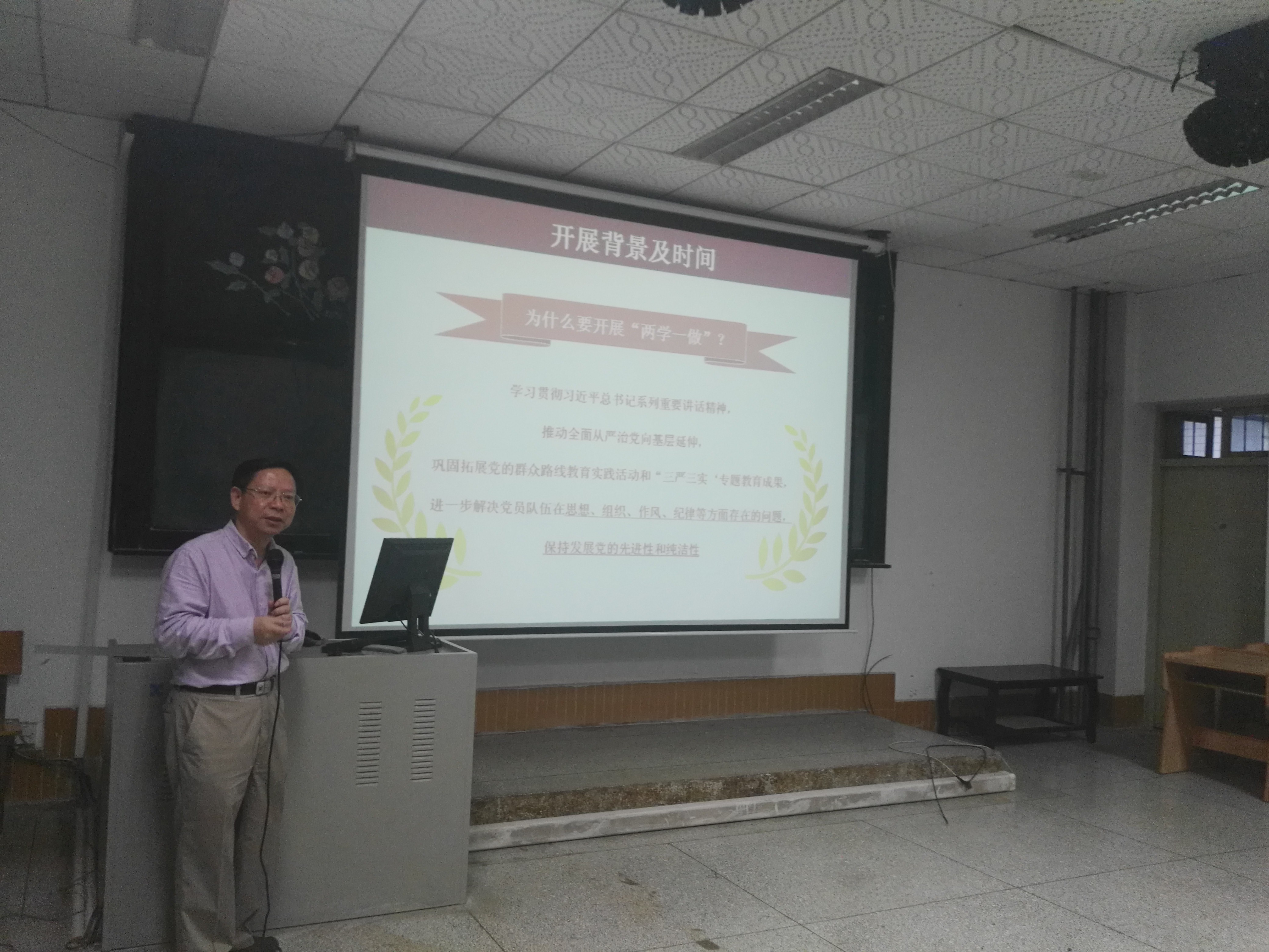袁洪教授以“以党章为镜,锤炼党性作风,保持党员先进性,认真开展“两学一做”为开篇,深入系统的围绕“两学一做”开展的背景及时间、“两学一做”的总体要求、增强党员的党性锻炼、全面理解共产党员标准、向榜样向群众学习等方面进行讲解和教育,强调共产党员八项权利和八项义务的重要性,最后袁洪教授认为习近平总书记系列讲话,凝结着13亿多中国人民的共同梦想,体现了我们党在理论和实践上的伟大创造,鼓励党员同志们向榜样学习,向群众学习,并希望八支部能够在今后的学习和工作中涌现更多的党员榜样,为党员们起到模范示范作用。