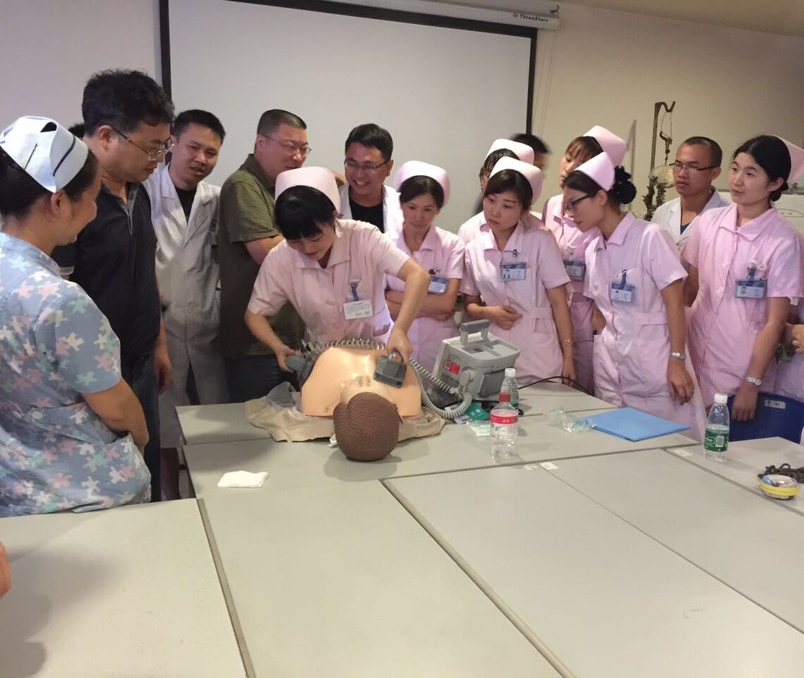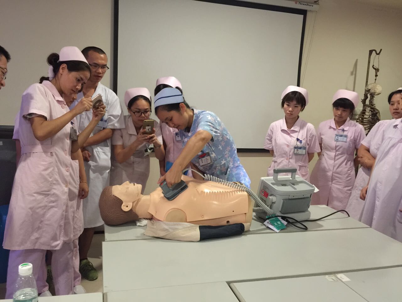 经过细致讲解和现场体验,医护人员纷纷上场进行实际操作。按照除颤仪需要的“通电、定位、充电、除颤”的四个步骤,现场进行操作演练。