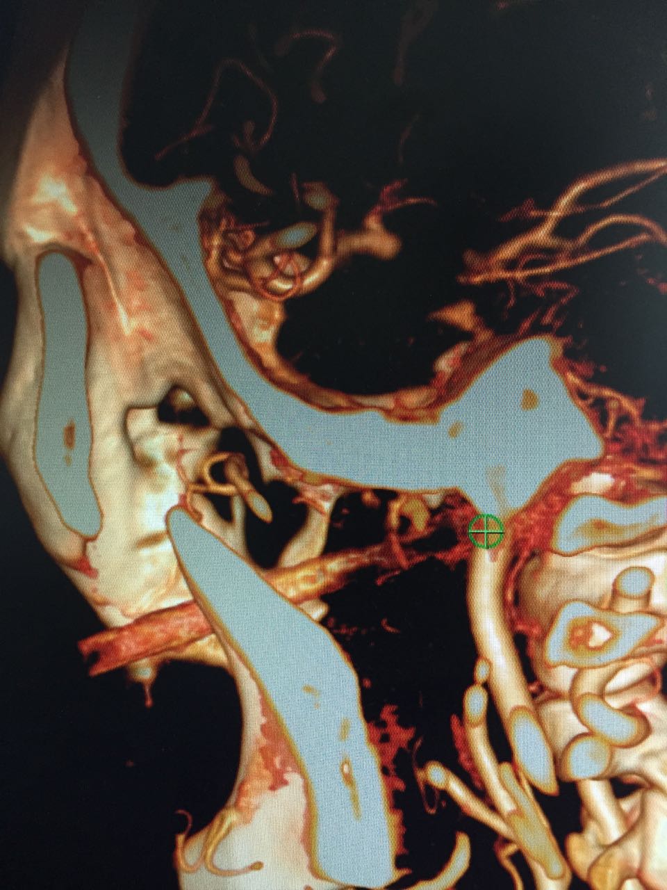 入院后立即完善术前的CTA检查,高分辨薄层CT以及三维重建结果进一步证实了谭国林教授的预判。长近10公分的竹棍从面颊部插入,避开眼球,紧贴颈内动脉壁插入颅底,并导致第一颈椎部分骨折,只差那么一点点就进颅内了。而且因为2个月的反复感染,动脉壁受侵蚀,动脉内大块的血栓形成,老人家随时都可能发生动脉破裂出血或者脑梗塞。
