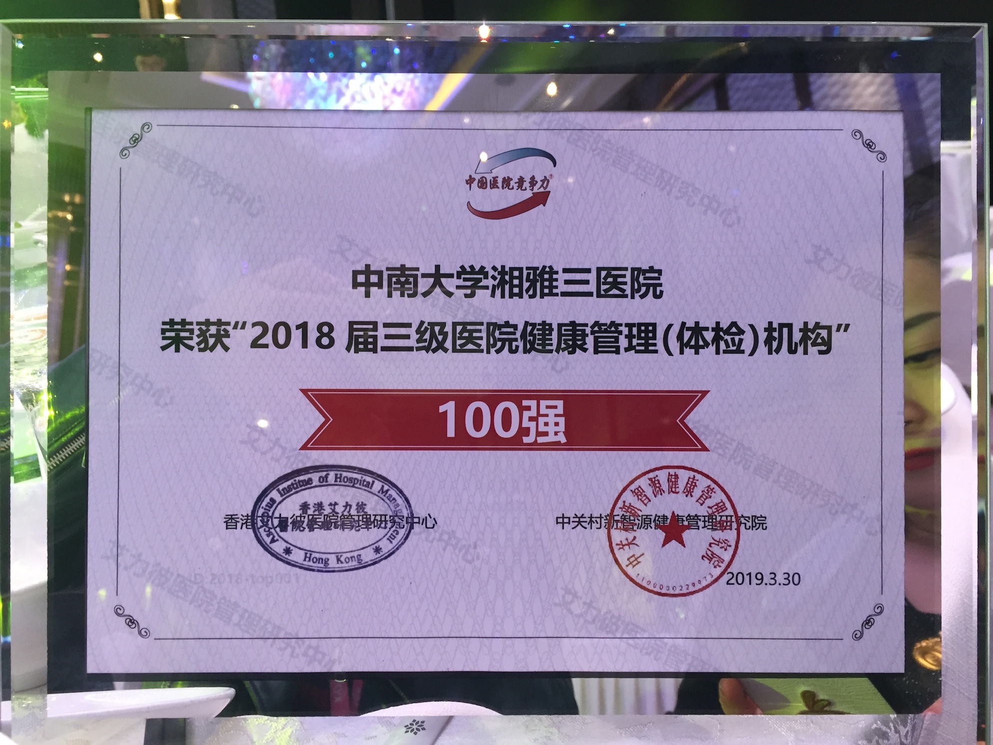 4月13日在长沙召开的“第四届中国慢病健康管理与大健康产业峰会(五湖健康大会)暨第四届中国·湘雅心血管健康管理论坛”上,由艾力彼医院管理研究中心联合中关村新智源健康管理研究院共同开展的《2018中国医院竞争力·三级医院健康管理(体检)机构100强》正式发布。四川大学华西医院、浙江大学医学院附属第二医院和中南大学湘雅三医院的健康管理科荣登前三甲。