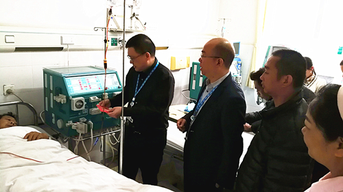 张国刚院长一行至肾内科病房对周某表达了慰问和关怀。他关切地询问患者的病情,叮嘱身边医务人员要尽力治疗、精心照护,并嘱咐周某安心养病,鼓励他勇敢战胜病魔,争取早日康复。随后送上慰问金。