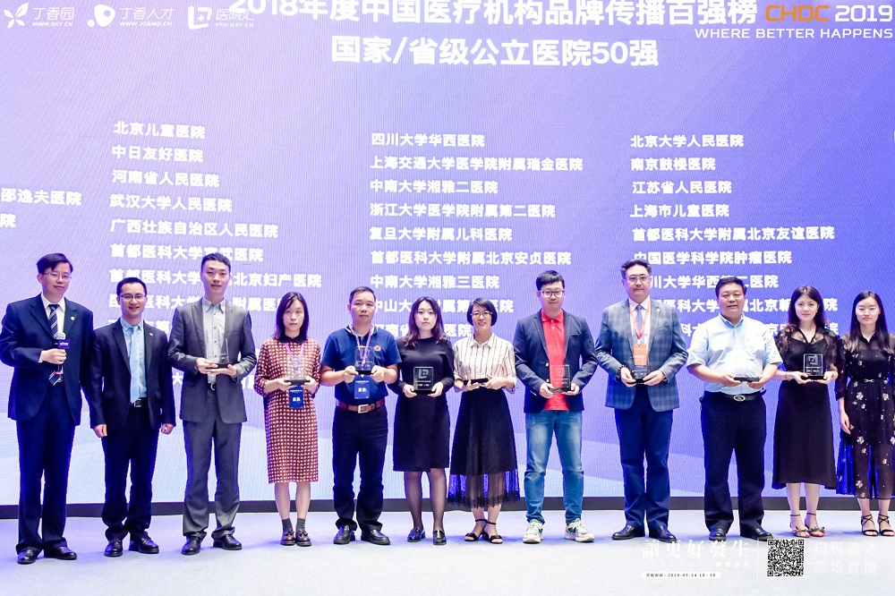 2019 年 5 月 24 日,由丁香园主办的“2019 中国医院发展大会”在杭州国际博览中心隆重召开。会上,丁香园、医院汇携手清博大数据,联合公布了“2018 年度中国医疗机构品牌传播百强榜”。中南大学湘雅三医院荣登“国家/省级公立医院50强”和“新媒体影响力50强”两项榜单。