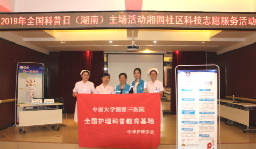 9月11日,以“礼赞共和国 智慧新生活”为主题的2019年全国科普日(湖南)主场活动启动仪式在湖南省主场活动在湖南省科学技术馆正式启幕,中南大学湘雅三医院护理部主任严谨带队,丁四清教授、钟竹青副主任等10余人参加了开幕式。本次活动由湖南省科学技术协会、湖南省委宣传部、湖南省教育厅、湖南省科技厅、湖南省农业农村厅、湖南省卫生健康委联合主办。