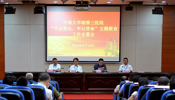 9月16日下午,中南大学湘雅三医院召开“不忘初心、牢记使命”主题教育工作布置会,正式拉开医院主题教育的序幕。中南大学党委第一指导组组长、党委组织部正处级组织员罗永忠,副组长、学校办公室副主任雷先阳,副组长、党委统战部副部长李燕峰,指导组联络员、湘雅二医院团委副书记唐婧琼出席会议。医院全体院领导,党总支部书记、党支部书记,全体中层干部参加,党委副书记杨飞龙主持会议。