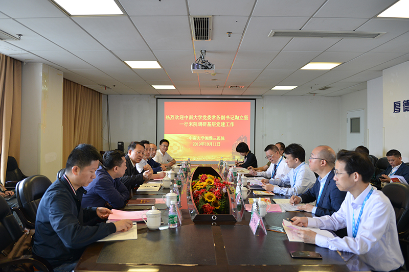 10月11日上午,中南大学党委常务副书记陶立坚一行来到湘雅三医院,就医院基层党建工作和主题教育工作展开调研和座谈。校党委党校常务副校长兼组织部副部长赵永正,党委组织部正处级组织员罗永忠、副部长柯朝晖、副部长凌春雨、副处级组织员张志宏、正科级干事钟旭东,湘雅三医院在院领导、组织干事、党总支书记及党群部门负责人参加座谈会。