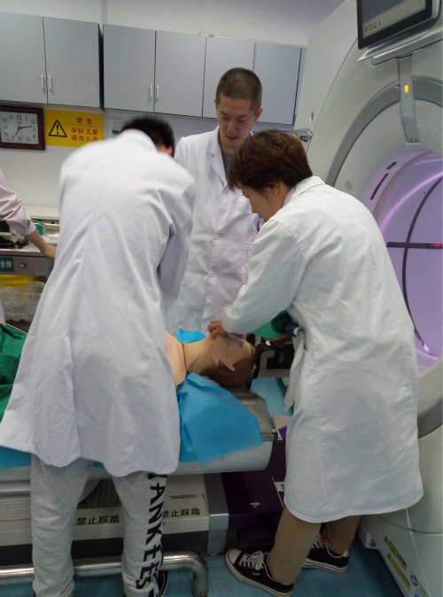 “病人出现异常,停止检查,技师老师和我进去查看病人情况!”护士和技师立即开门进去查看病人情况。当班护士判断“病人”无意识、无呼吸、无颈动脉搏动须马上进行抢救,立即呼叫当班医师。技师立即通知急诊科医师过来参与抢救。与此同时,护士建立静脉通路,推近抢救车和除颤仪,进行心电监测。医生随即赶到,和护士配合将“病人”去枕平卧、开放气道、徒手心外按压、球囊面罩给氧、静脉给药……技师在一旁记录抢救过程并和医生轮换徒手按压。“病人心率恢复,室颤心率,需立即进行电除颤!”紧接着医生和护士配合对“病人”进行电除颤。除颤结束,“病人”恢复正常窦率,给予吸氧,转运至急诊科(或病房)。至此,“病人”抢救成功,一系列配合娴熟有序。整个演练及培训持续两个小时,并取得圆满成功。
