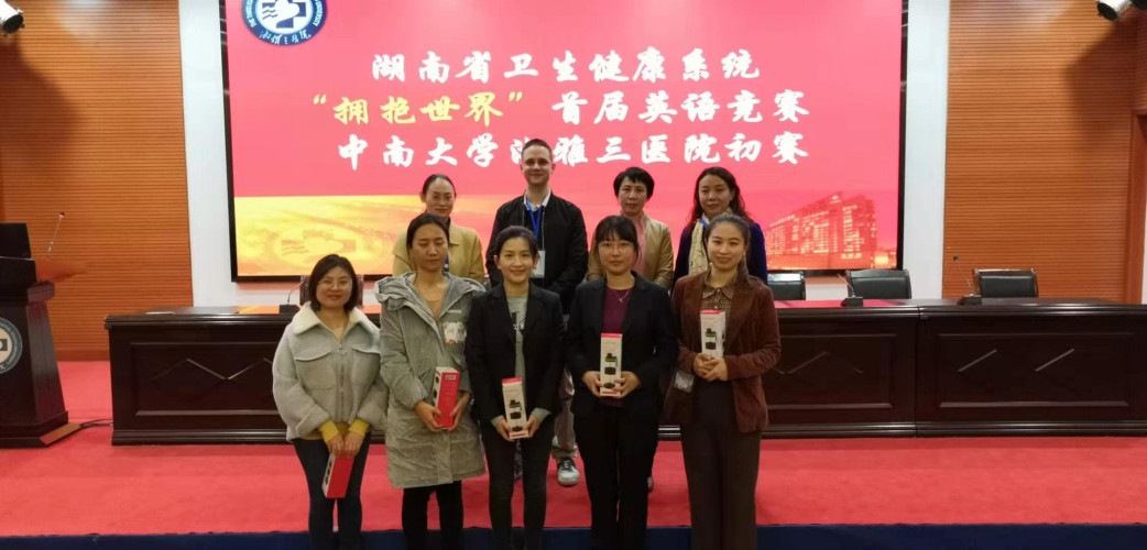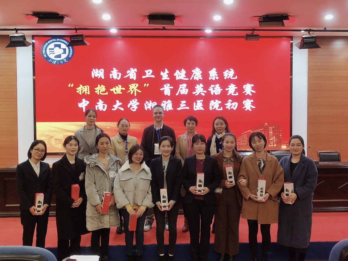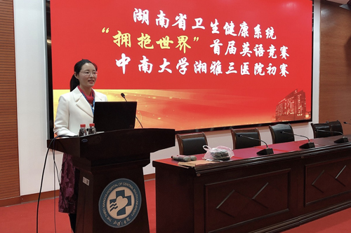 12月6日,2019年湖南省卫生健康系统"拥抱世界"首届英语竞赛中南大学湘雅三医院初赛在外科楼二楼学术报告厅举行。本次竞赛由湖南省卫生健康委员会、湖南省医学教育科技学会国际合交流合作专业委会联合发起,旨在进一步提高全省医疗卫生专业技术人员的英语实践运用能力和国际卫生合作的交流能力,充分发现、挖掘和培养专业精、外语强的医疗卫生人才。湘雅三医院初赛由国际合作与交流办牵头组织,院团委、护理部给予了大力协助。湘雅三医院党委委员、副院长朱晒红莅临比赛现场并致辞。门诊办、团委、相关临床业务科室负责人以及医务人员代表约50人到场观看。