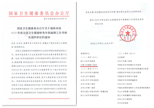 2019年12月6日,国家卫生健康委通报表扬了2018年度全国卫生健康财务年报编制工作考核先进的单位,中南大学湘雅三医院荣获一等奖。