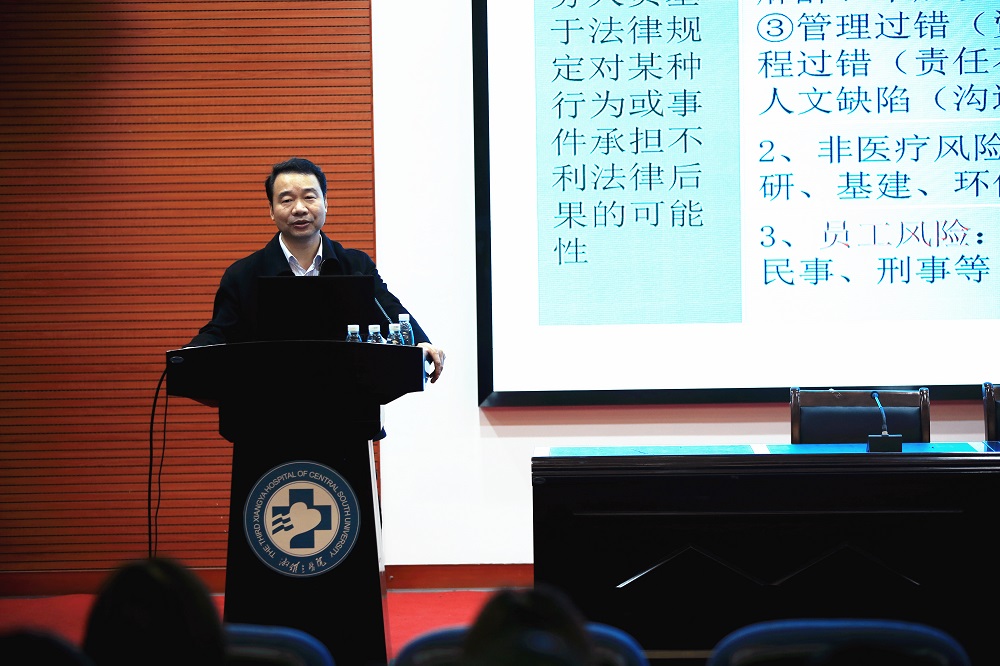 曹跃斌处长以“医护人员法律风险浅谈”为题,从医院法律风险管理概念、分类和风险等级引题,详细讲述了医护人员作为自然人和职业人存在的法律风险并根据《侵权责任法》《执业医师法》《医疗机构管理条例》等法律法规相关内容,就如何应对和防范法律风险为大家提出解决方案。