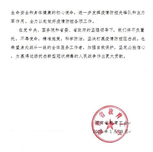 1月28日, 湖南省教育工会发出《致奋战在抗击新型冠状病毒一线教职工的慰问信》,向全省高校附属医院教职员工们表示衷心的感谢和崇高的敬意。