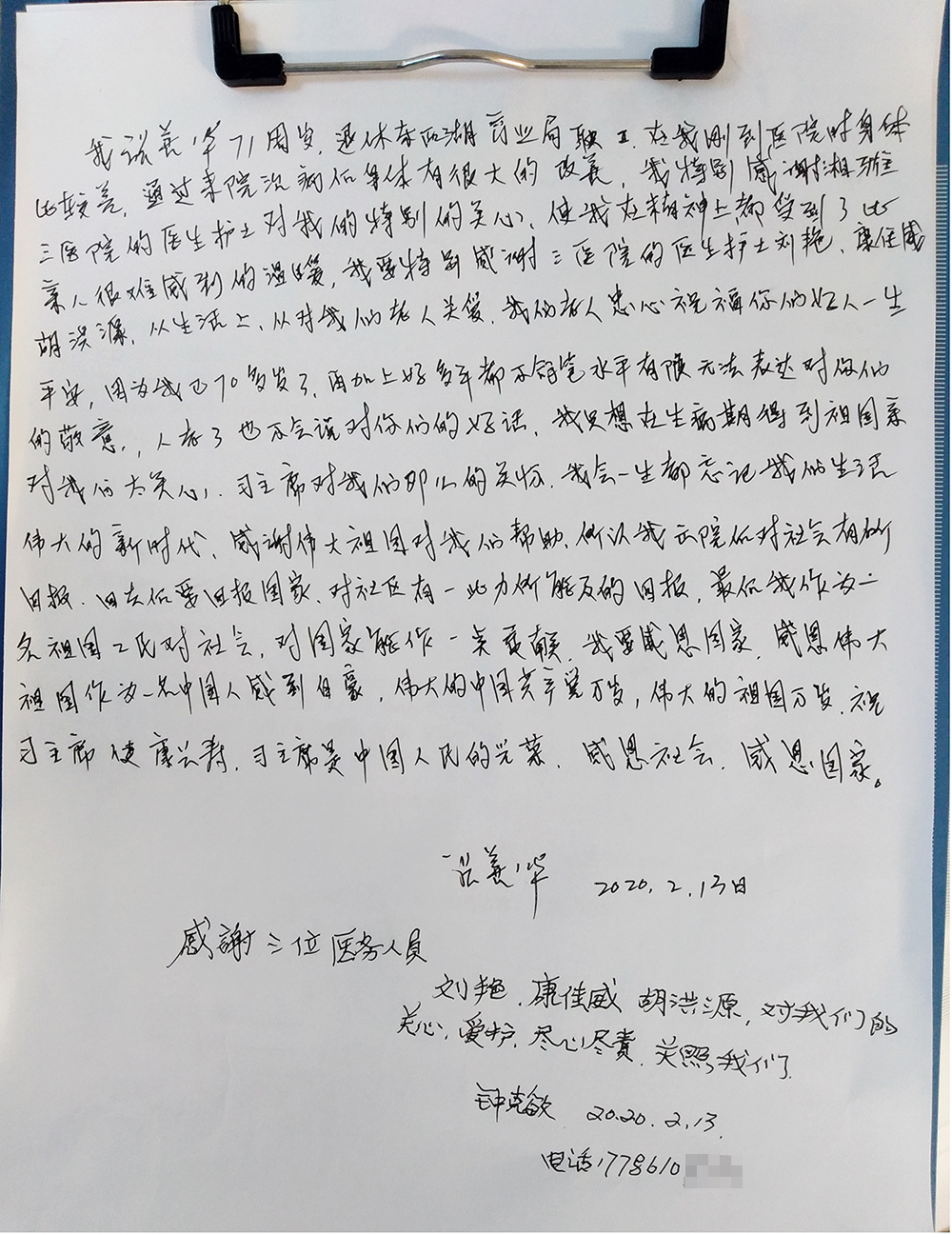 他写道:“我张善华,71周岁,退休于东西湖商业局职工,在我刚到医院时,身体比较差,通过贵院治疗后身体有很大的改善,我特别感谢湘雅三医院的医生护士对我的特别的关心,使我在精神上收到了比亲人还难以得到的温暖,我要特别感谢三医院的护士刘艳、康佳威、胡洪源,从生活上给我们老人关爱,我们老人衷心祝福你们好人一生平安。因为我已70多岁了,再加上好多年都不拿笔,水平有限,无法表达对你们的敬意,人老了也不会说对你们的好话,我在生病期间得到祖国对我的关心、习主席对我们的关怀,我一生都不会忘记,我们生活在伟大的新时代,感谢伟大祖国对我们的帮助,所以我出院以后会对社会有所回报。回去以后,我要回报国家、对社区有一些力所能及的回报。最后,我将作为一名祖国公民对社会、对国家能作一点贡献。我要感恩国家,感恩伟大的祖国,作为一名中国人,我感到自豪。伟大的中国共产党万岁,伟大的祖国万岁,祝习主席健康长寿,习主席是中国人民的光荣所在,感恩社会,感恩国家。感谢三位医务人员:刘艳、康佳威、胡洪源,对我们的关心、爱护、尽心尽责关照我们。”