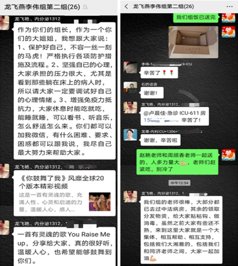 亲切的龙飞艳是二组的组长,她和副组长李伟一起把每一个队员的名字都记在心里,将物资手把手交给每一个人。她说:“我们这个小分队一个都不能少,大家同进退!”再三叮咛,生怕大家在工作中受到丝毫伤害。为了避免大家穿了防护服不透气,提醒大家穿好防护服一定要适应几分钟再进去护理病人,下班后一定要休息好。坚强的她直到看到丈夫的“与妻书”和8岁幼子鼓励妈妈写的小诗,才忍不住流下眼泪。副组长李伟是资深的呼吸治疗师,从医院回来,他带着一批呼吸治疗师研究新冠病人呼吸机流程,为患者的呼吸治疗保驾护航。龙果的工作任务是给组员发放物资和药品,蒋洁琼、褚冬燕、肖霞等老师利用自己休息时间给小组成员运送物资和送餐,整个第二组,就像一个大家庭,互帮互助,互相关心。