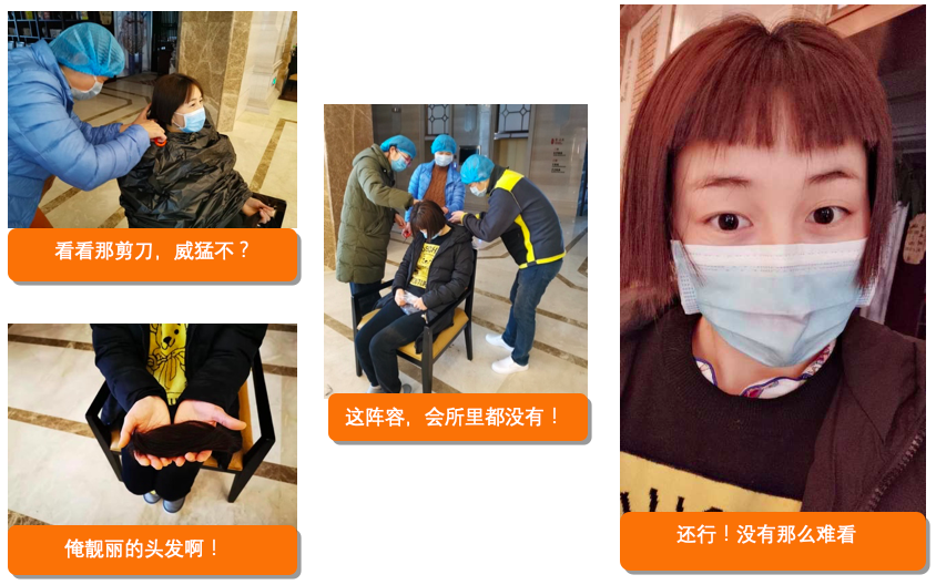 昨天钟老师和厉护士长说我的头发长了,会增加暴露的风险,于是约好了今天10点剪头发,换好衣服准点到一楼,“苏妈妈”已经在等我们了,垃圾袋当围裙非常妙,一把奶奶常用的平剪能把我这头秀发剪好了那绝对得服。无准备工作,直接开剪!同事狐狸问我,你心疼吗?(当然心痛啊!年前才弄好的)我回答:“安全第一”,“你舍得吗?她继续问……一会儿功夫,大功告成。“好可爱”,“好像小丸子”“底子好怎么样都好看”… (回去拿手机照,就差没哭了)大家说,“你看,你给了其他同志剪短发的勇气了”! 对,没错!鼓起勇气报名参加援鄂医疗队是我作为医者的初心;长久离别家人、朋友、同事的勇气是我深知作为一名医务工作者的使命;进入病房,跟新冠病人做宣教,安抚他们的勇气是我们白衣天使的职责!丘吉尔说:“勇气是人类最重要的一种特质,倘若有了勇气,人类其他的特质自然也就具备了 ”多少勇气凝聚多少温度,就是这如融化钢铁的温度足以摧毁所有病毒。