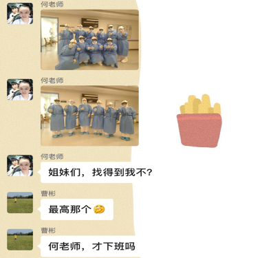 你偶尔在群里的冒泡和朋友圈的更新我们都很兴奋、很担心。每一次医疗队的老师们发了照片,我们总是在默默地寻找你的身影。我们有太多话想说,尽管都是一些关心的叮嘱,尽管都是一些细碎的家常,可是我们怕打扰了你休息,总是在你冒泡的时候才多发几条信息。前几天,你说睡眠不太好,要吃安眠药才能睡着,手机屏幕前的我们很心疼,交代尽量不要吃,要自我调适。两个星期过去了,你睡眠好些了吗?那边的饭好吃吗?有没有在酒店里坚持运动?下次要给我们直播哦。
